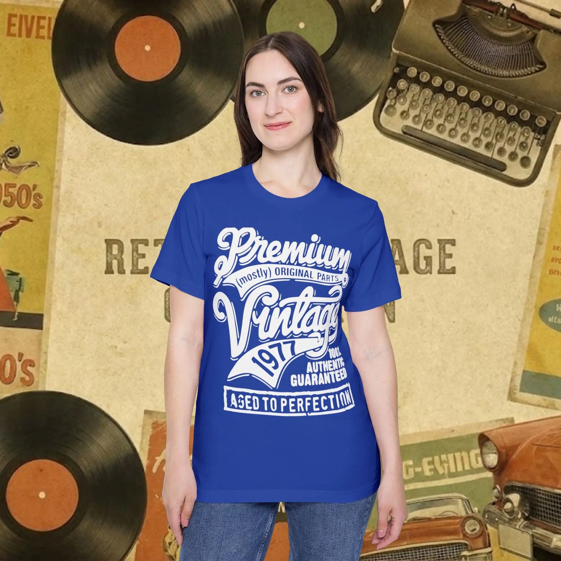 Design: Retro "Vintage 1977" typography with a weathered, heritage finish.